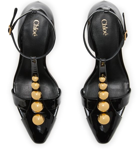 Reveal chloe's Cleia sandals, crafted in patent leather with a pointed closed toe and a buckled ankle strap for a secure fit. The high stiletto heel and gold-finish studded details add a refined edge, while logo accents on the heel and insole showcase signature flair.