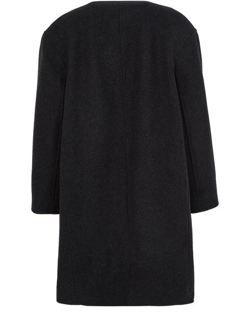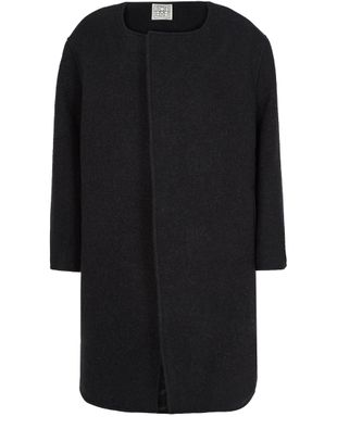 Reveal Toteme's collarless 3/4 coat, a masterpiece of regular fit and knee-length elegance. This long-sleeved design features a concealed closure, offering a seamless silhouette. Perfect for any occasion, its classic overcoat style ensures timeless appeal.