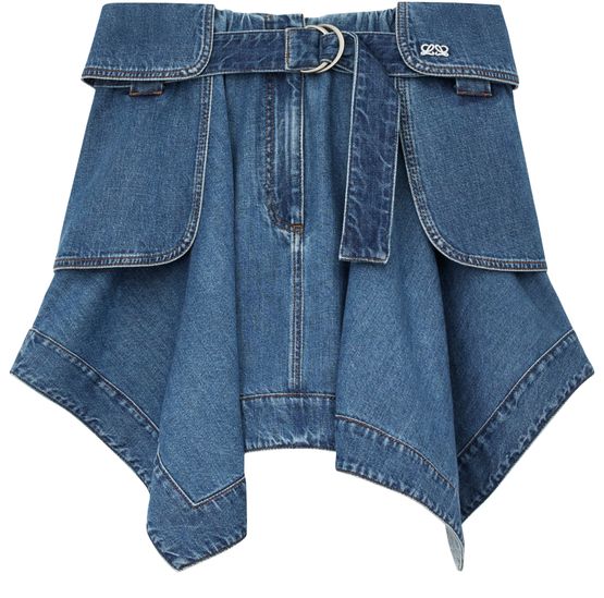 Reveal Loewe's denim mini skirt, crafted with an asymmetric cut and belted waist for a modern edge. Large side flap pockets and visible stitching add a utilitarian flair, while the mini length and premium denim ensure a fresh, versatile look for day or night.