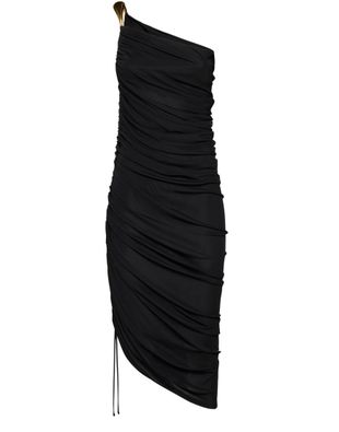 Bottega Veneta's midi dress is crafted from stretch viscose jersey, creating a sleek and comfortable fit. The bare shoulder design and pleated details add a touch of elegance, while the slim fitting silhouette gives a flattering look. Perfect for any occasion, this dress combines sophistication and modernity effortlessly.