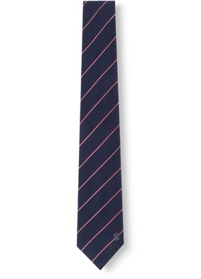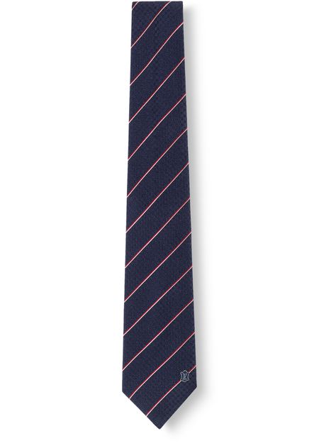 The stylish Ecu tie combines Petit Damier checks with a contrasting narrow stripe in shiny silk. It is finished with the LV initials in a discreet escutcheon.