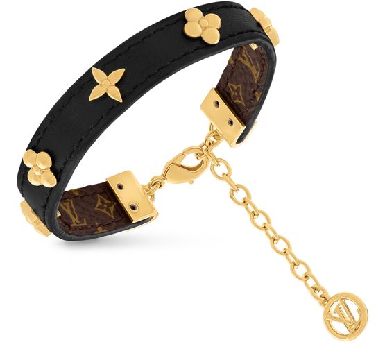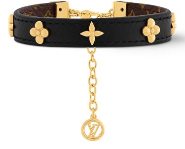 The elegant, wrist-friendly Fleurs Rivets bracelet offers an original reinterpretation of Louis Vuitton’s cherished emblems. A smooth leather band is studded with gold-tone metal Monogram Flowers, recalling the rivets on the House’s historic trunks. The Monogram pattern on the inside and an LV Circle charm on the adjustable chain add an extra signature flourish.