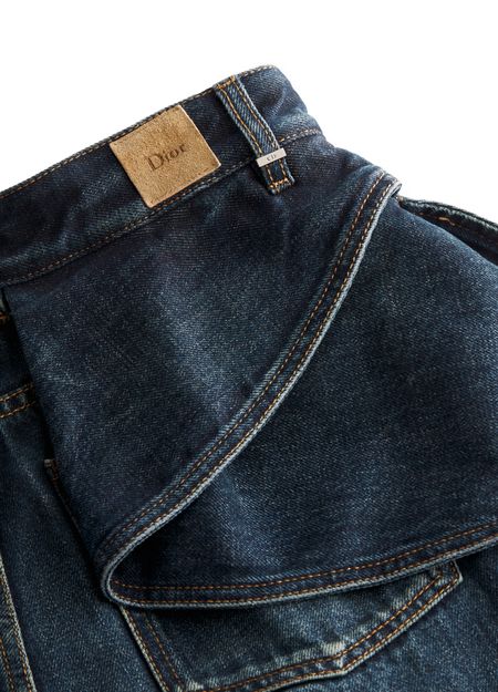 Reveal Dior's Draped Flared Jeans - crafted with precision, featuring belt loops and a signature silver-tone CD metal ring at the back. The design boasts a buttoned closure with CD buttons and a statement Dior leather patch, ensuring an unlined, sophisticated look.