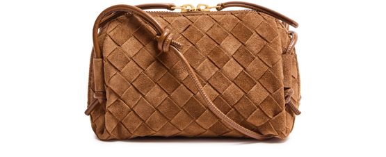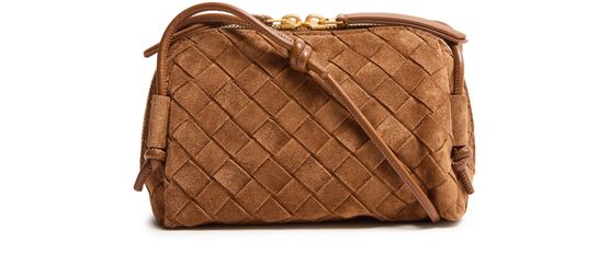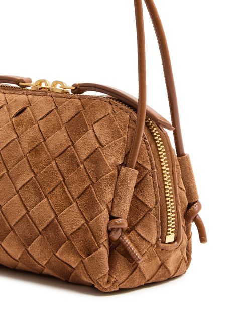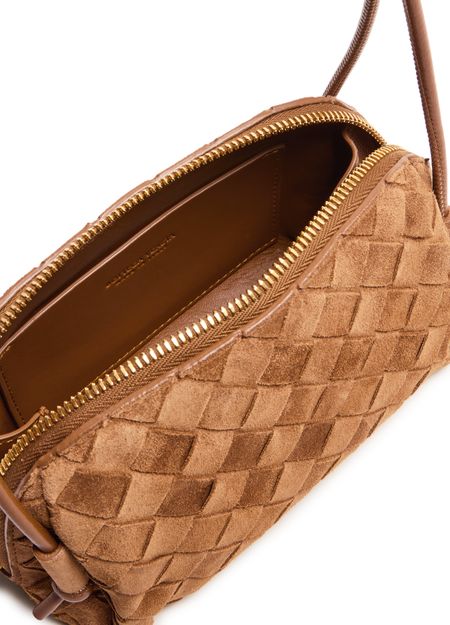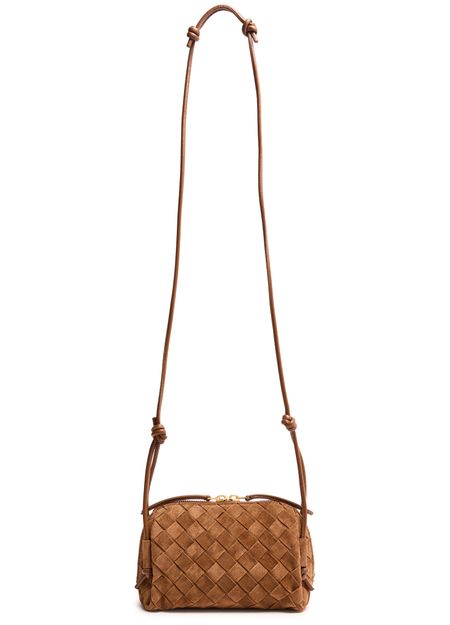 Reveal Bottega Veneta's mini bag, crafted in sumptuous suede with the iconic Intrecciato weaving technique. A gold finish, visible topstitching, and an adjustable thin strap add refined detail, while a single compartment and open interior pocket ensure effortless organization with a sleek zipper closure.