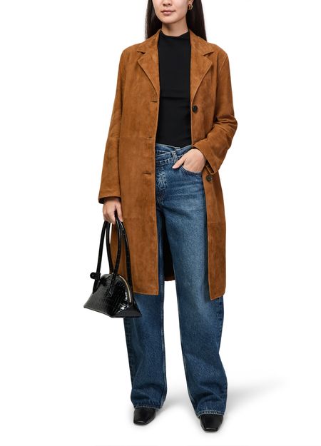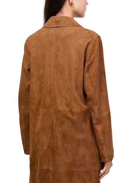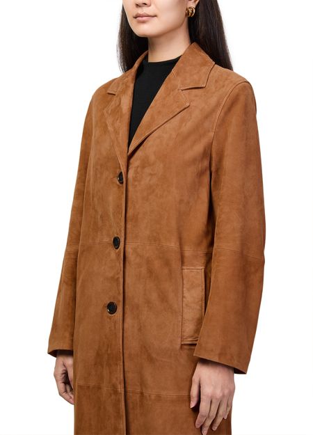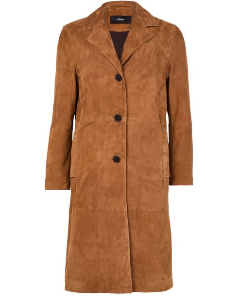 Reveal Arma's Jella suede coat, crafted in supple suede for a refined touch. The long silhouette, classic collar, and three-button closure create a timeless profile, while side pockets add practicality. This versatile piece transitions seamlessly from day to night, elevating any ensemble with understated sophistication.