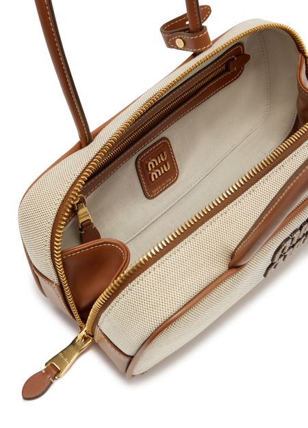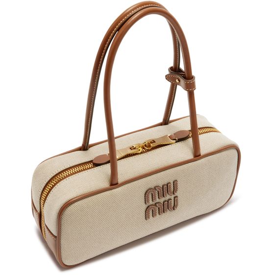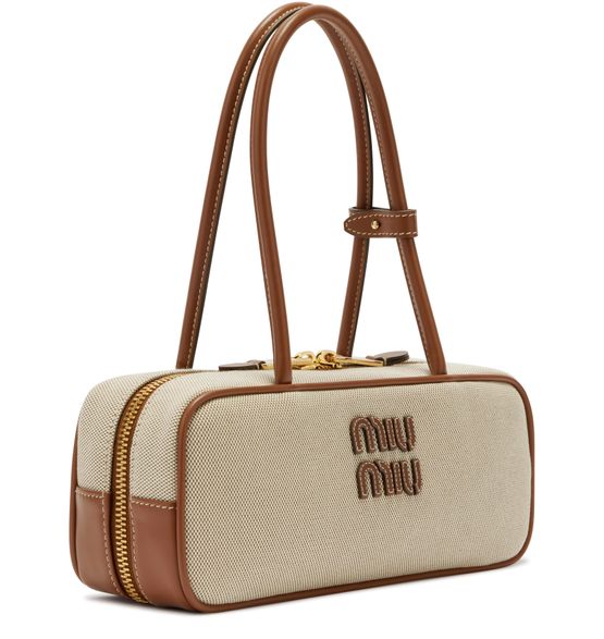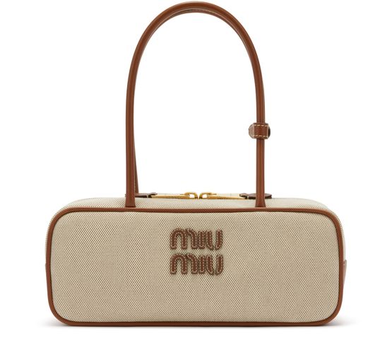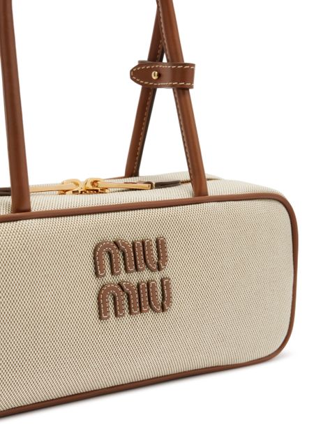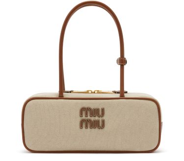 • Description : Shoulder bag, embroidered "miu miu" logo, double handles, leather handle, carry handle, front logo, appliquéd logo, logo on the inside, zipper closure, zippered interior pocket.