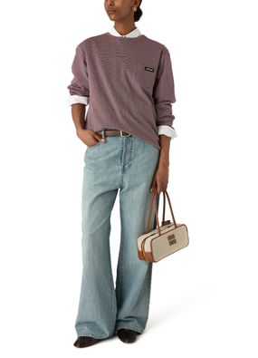 Reveal Miu Miu's embroidered shoulder bag, where signature craftsmanship meets modern design. The double handles and metal finish elevate its silhouette, while a spacious interior with a zippered pocket ensures effortless organization. An appliquéd logo on the front adds a refined touch to this versatile accessory.