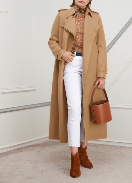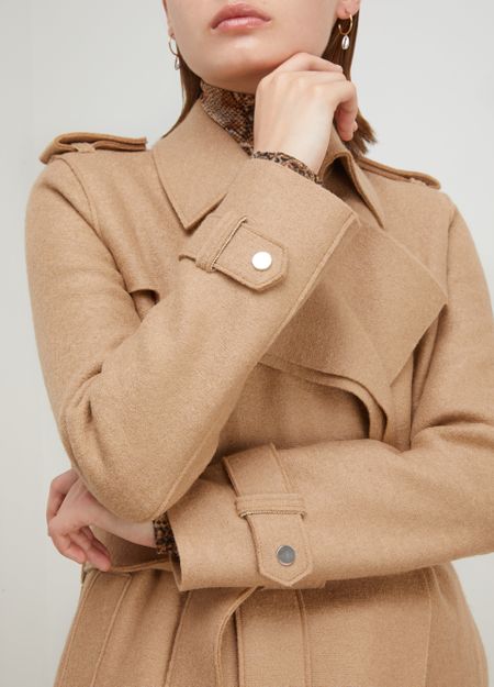 The London-based brand Harris Wharf is offering wool pieces bursting with character like this virgin wool coat. Our favorite part is the model's elegant detailing like the adjustable tabs at the cuffs and shoulders and the architectural notched collar. Tie the coat's belt to get a very feminine figure.
