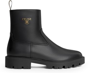 Indulge in Celine's Margaret boots in calfskin, featuring a round toe shape and the "Celine Triomphe Paris" gold embossed signature. With a Triomphe twill pull tab at the back, side zip closure, leather insole, and rubber outsole with leather welt, these boots marry elegance with comfort.