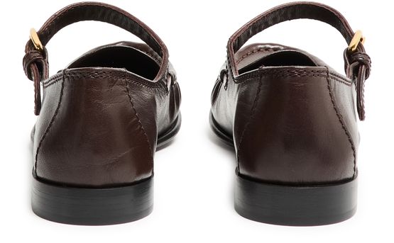 Reveal Miu Miu's Mary Jane-style leather loafers, crafted from smooth leather with a refined round toe and a secure buckled strap. The low heel and logo-printed insole ensure comfort, while gold-finish details and visible topstitching add a sophisticated touch to this modern essential.