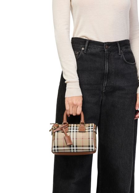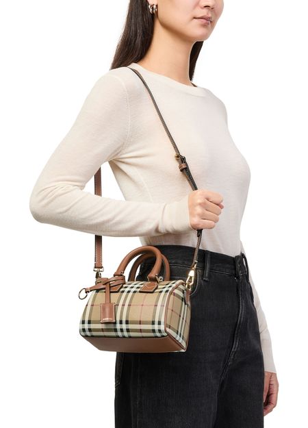 Reveal Burberry's Mini Check bowling bag, crafted from grained leather and embroidered canvas. The iconic Burberry Check pattern and signature 'b' fastener add a refined touch, while an adjustable, detachable thin strap and interior pocket offer versatile functionality for modern style.