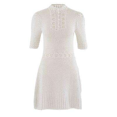 Unveil Celine's mini dress with embroidered trims in cotton Batiste. This classic fit piece features Triomphe embroidered fish scale trims, a sophisticated shirt collar, and short sleeves. Accented with four mother-of-pearl buttons, it offers a mini length that effortlessly blends elegance with modern charm.