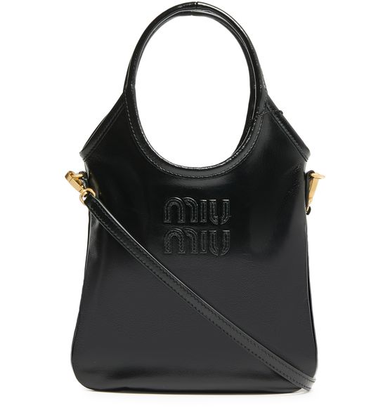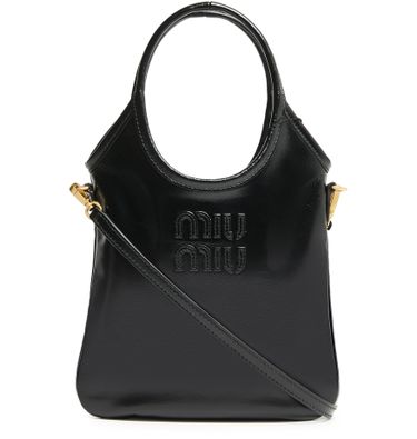 Reveal Miu Miu's mini Ivy soft leather bag, crafted from smooth leather with a printed Miu Miu logo. The gold finish hardware, double handles, and a thin, adjustable strap offer versatile styling. A single compartment and interior pocket ensure both elegance and everyday practicality.