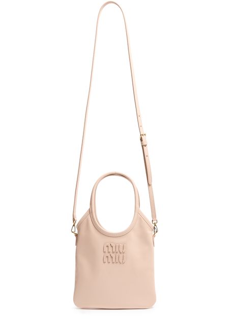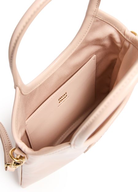 Reveal Miu Miu's mini Ivy soft leather bag, crafted from smooth leather with a printed Miu Miu logo. The gold finish hardware, double handles, and a thin, adjustable strap offer versatile styling. A single compartment and interior pocket ensure both elegance and everyday practicality.