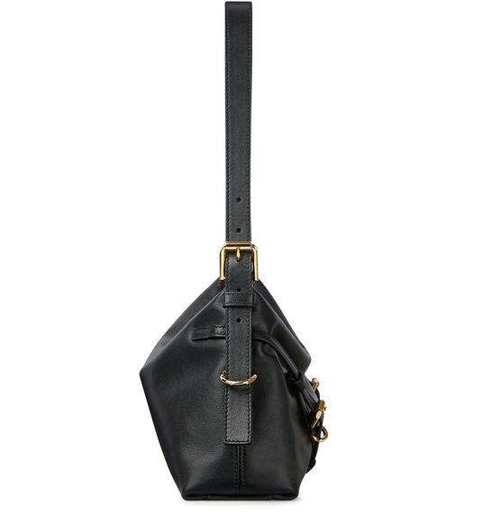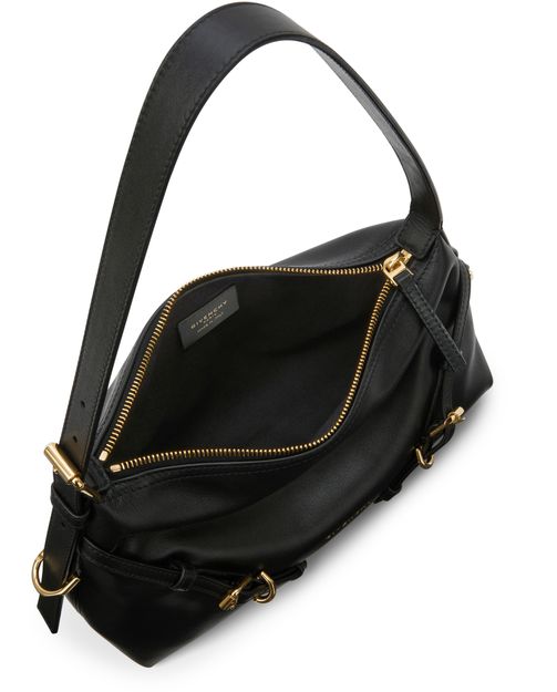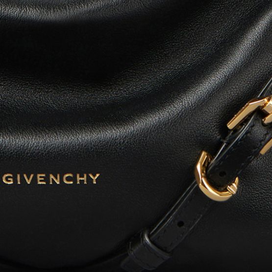 Reveal Givenchy's Voyou mini shiny leather bag, crafted from smooth leather with a single handle. This elegant piece features a zipper closure, a single compartment, and visible topstitching. The front logo in gold letters adds a touch of sophistication, complemented by a gold finish.