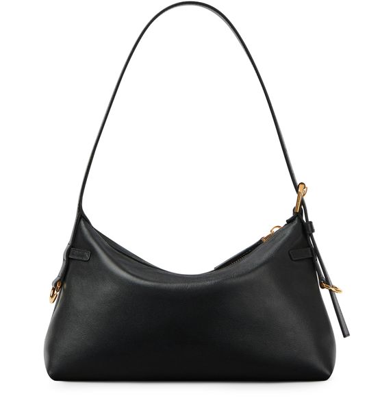 • Description : Shoulder bag, single handle, leather handle, front logo, logo in gold letters, smooth leather, zipper closure, visible topstitching, gold finish, strap length min: 22 cm.
