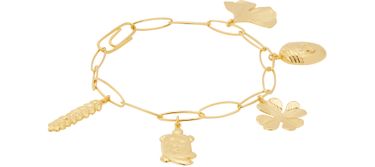 Aurélie Bidermann combines mischievousness and femininity in this multi charm bracelet that is full of symbols. The fine chain with large links boasts five of the Parisian designer's favorite talismans. The scarab, ear of corn, and the four-leaf clover turn this gold-colored jewel into a modern-day lucky charm. Pair it with a T-shirt and denim skirt.