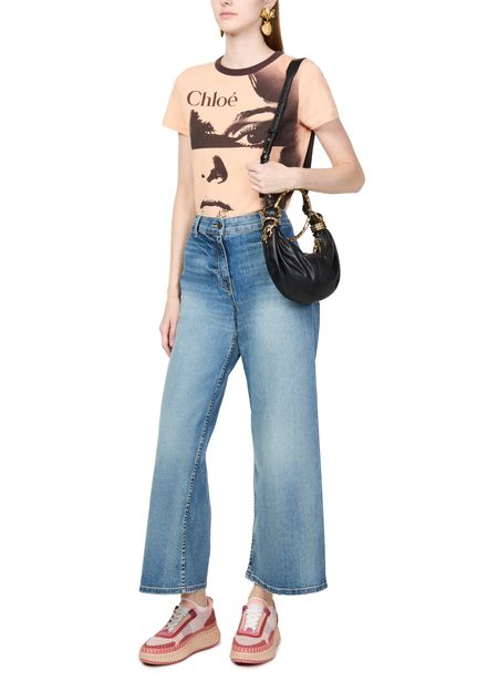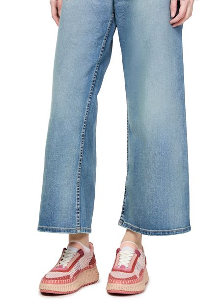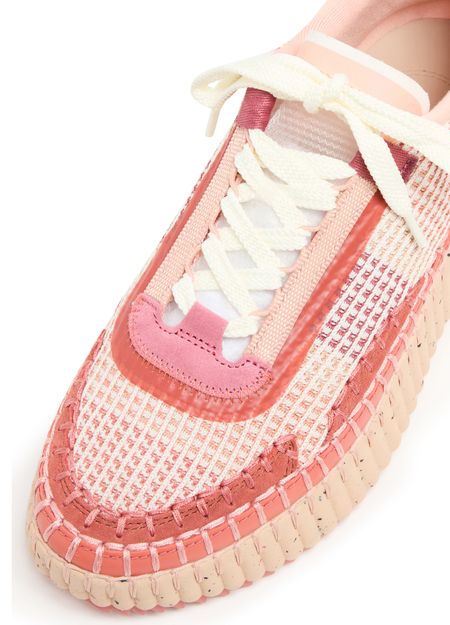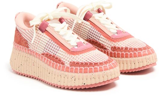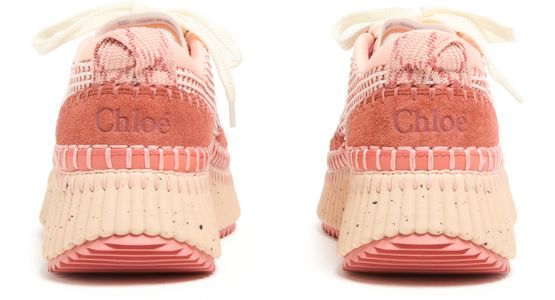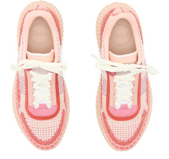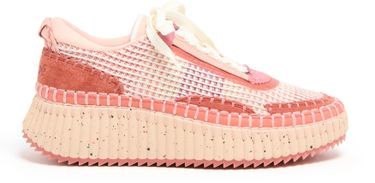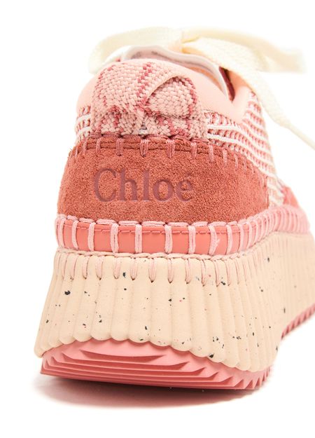 Reveal Chloe's Nama sneakers, crafted with open weave and smooth leather for a refined look. The round toe and closed design offer comfort, while laces and a strap ensure a secure fit. Contrasting soles and visible stitching add a modern edge, finished with a logo at the back.