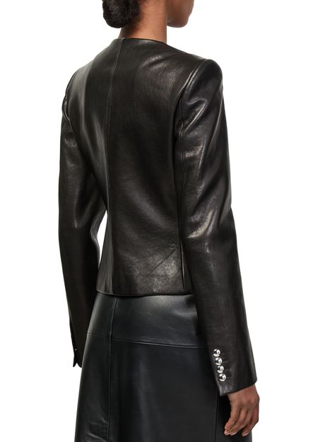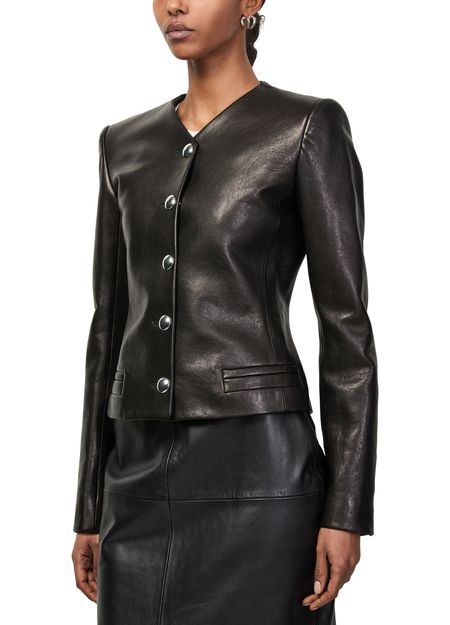 Reveal Khaite's Nara leather jacket, a collarless biker jacket with a short, modern silhouette. Crafted from supple leather, it features long sleeves, button fastening, and sleek welt pockets. This versatile piece transitions effortlessly from day to night, adding a refined edge to any ensemble.