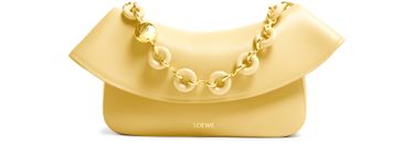 Introducing Loewe's Ola medium bag, an exquisite shoulder bag crafted from smooth leather. Its single handle and decorative chain strap add a touch of modern elegance, while the visible topstitching and front logo in gold letters enhance its sophisticated appeal. Perfect for those who appreciate fine craftsmanship.