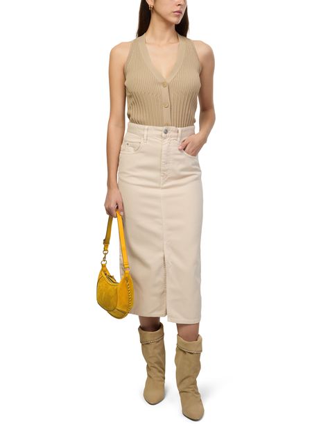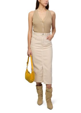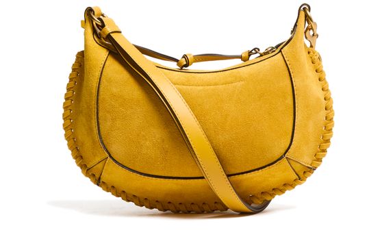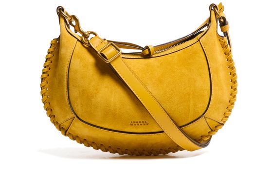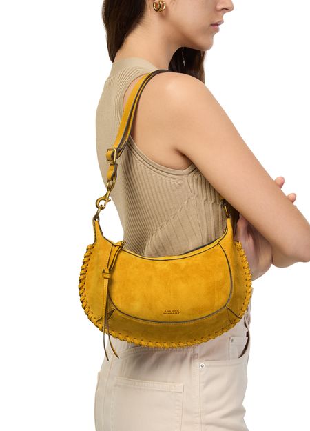 Reveal Isabel Marant's Oskan Moon bag, a masterpiece of modern design. Crafted from luxurious suede, this shoulder bag features a thin, adjustable strap for versatile wear. The scalloped edge and contrast stitching add a touch of elegance, while the embossed logo golden metal details complete its sophisticated look.