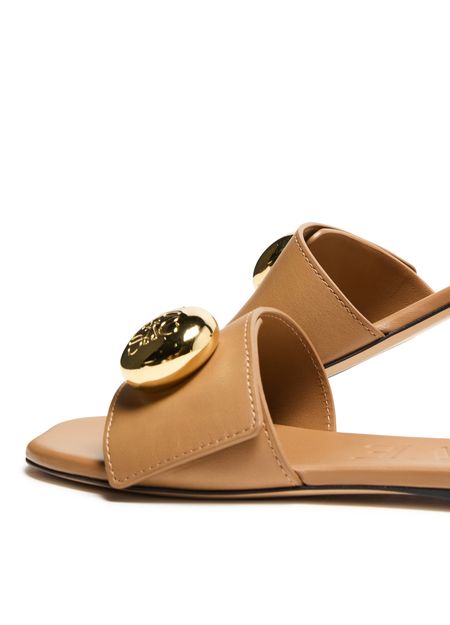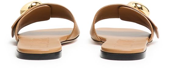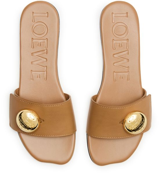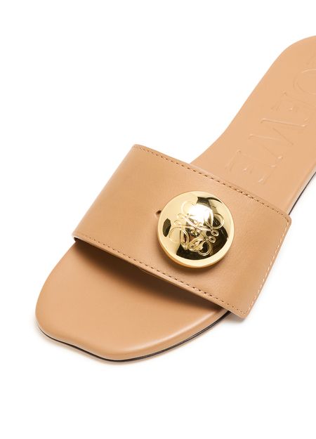 Reveal Loewe's Pebble slide in soft calfskin, crafted from smooth leather with a refined square open toe and low heel. The visible stitching and engraved logo add a signature touch, while the gold finish elevates these slides for a polished, modern look.