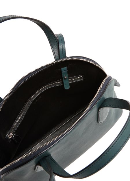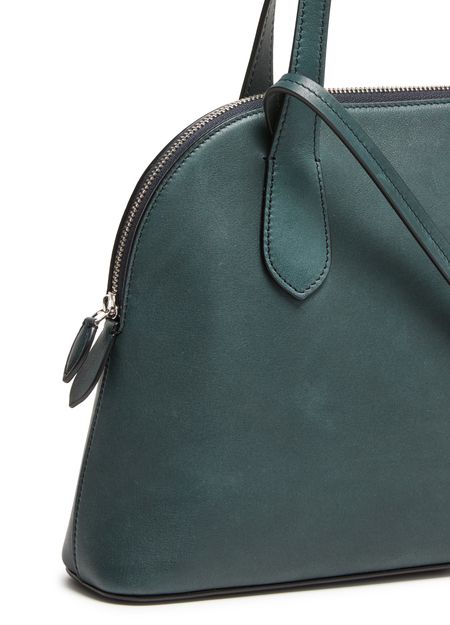 Reveal The Row's Peggy leather clutch bag, crafted from smooth leather with visible topstitching and a refined metal finish. The adjustable thin strap and double handles offer versatile carrying options, while the spacious interior and zippered pocket ensure both style and practicality for modern essentials.