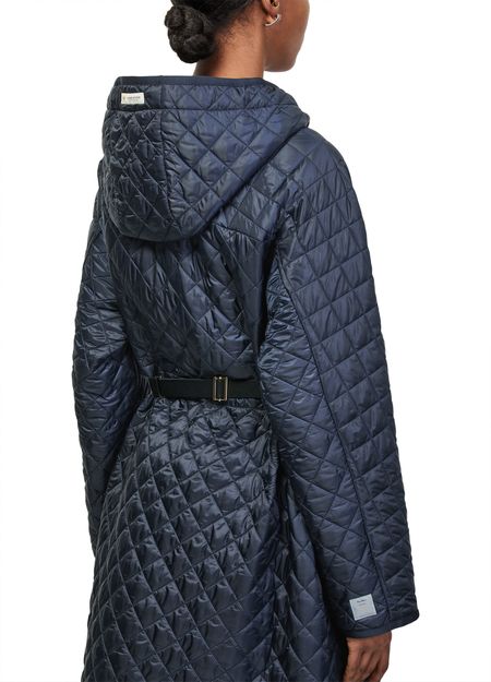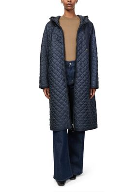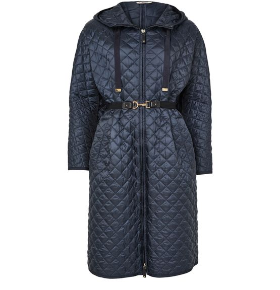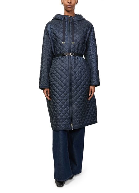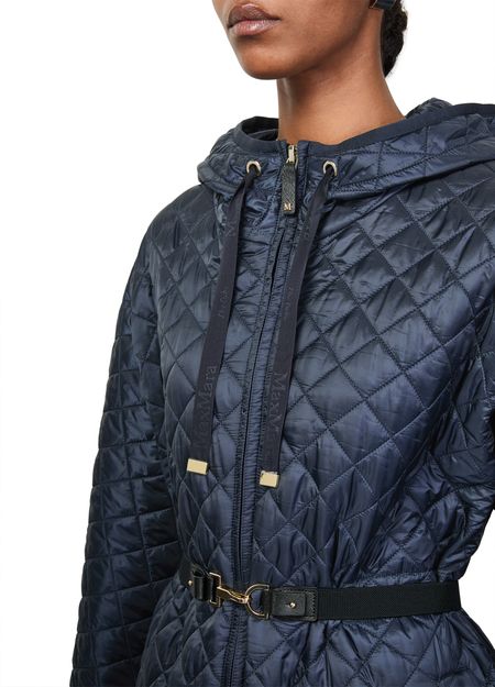 Reveal Max Mara quilted hooded coat, crafted from chevron quilted leather with a distinctive diamond pattern. The knee-length, collarless silhouette features a padded texture, long sleeves, and a sleek zipper closure. Side pockets add practicality, making this puffer a versatile choice for both casual and refined looks.