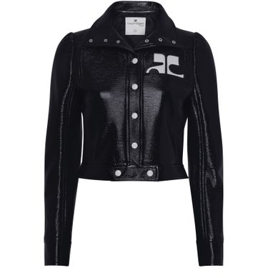 This reedition vinyl jacket features a long-sleeved design with a front buttoned closure for a sleek look. It showcases a front logo and chest logo, as well as a logo at the back label for added brand recognition. The jacket is accented with studded details, a crop length, and a stylish silver finish.