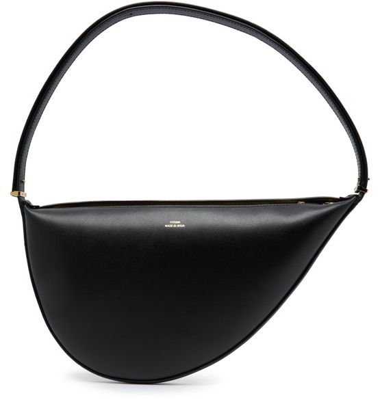 Toteme's Scooped sling bag in leather is a stylish accessory designed for versatility. Hand carried with a single handle and thin strap, it features a zipper closure and a single compartment. The front logo in gold letters adds elegance, while interior patch pockets keep essentials organized in chic sophistication.