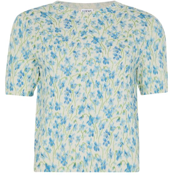 Introducing Loewe's short sleeve sweater. Crafted with a ribbed texture, this regular fit top features a crew neck and short sleeves for a contemporary silhouette. The all-over floral print adds a vibrant touch, while visible stitching enhances its modern appeal. Perfect for pairing with your favorite high-waisted jeans.