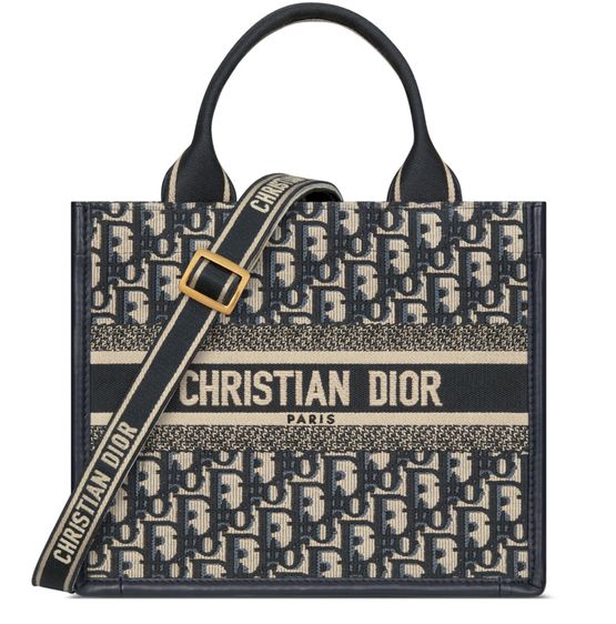 Reveal Dior's Small Dior Book Tote Bag, an exquisite tote bag with two handles and a logo on the front. This piece boasts embroidery and can be elegantly carried by hand or on the shoulder, making it a versatile addition to any ensemble.
