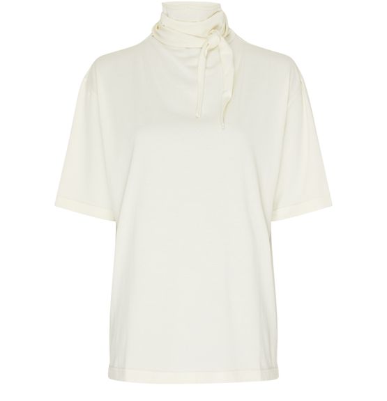 Lemaire's T-shirt with foulard showcases a short-sleeved silhouette and a high-neck design, blending sophistication with casual ease. Crafted from soft fabric, it drapes effortlessly, making it a versatile choice for any occasion. The unique foulard detail adds a touch of elegance, elevating your everyday style with effortless charm.