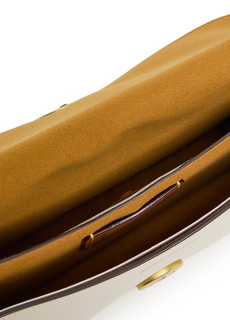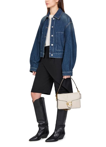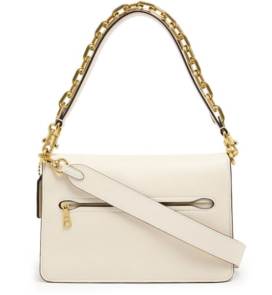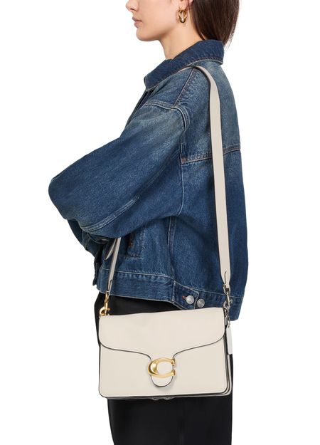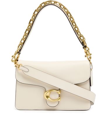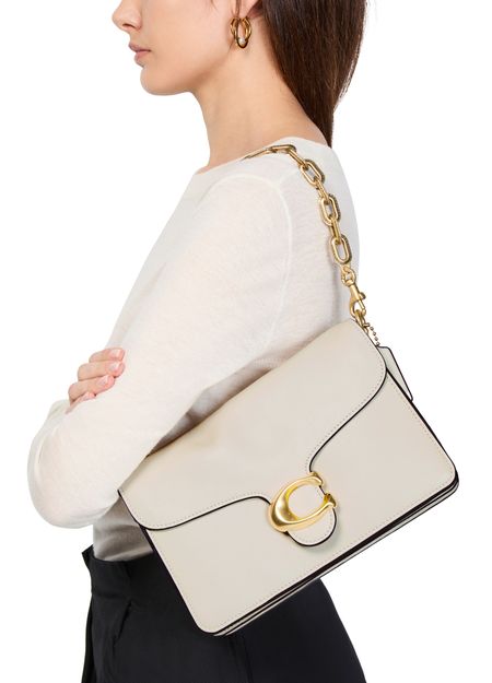 Reveal Coach's Tabby shoulder bag, featuring a magnetic flap closure and an elegant gold finish. With double handles, a front logo, a back pocket, and visible topstitching, this bag offers versatile style with a detachable wide chain strap.