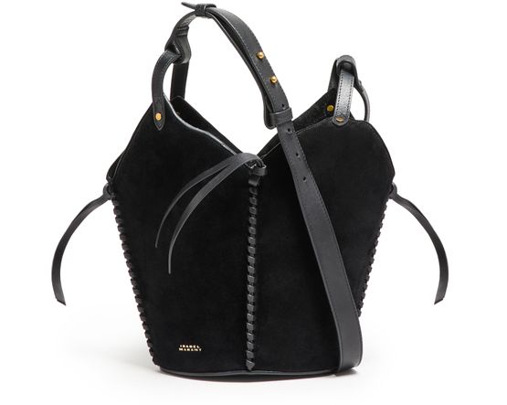 Reveal Isabel Marant's Tampa mini bag, a sophisticated piece featuring visible topstitching and a gold-printed logo. This bucket bag is elegantly carried on the shoulder with a thin, adjustable strap. Its single compartment includes interior patch pocket for practicality.