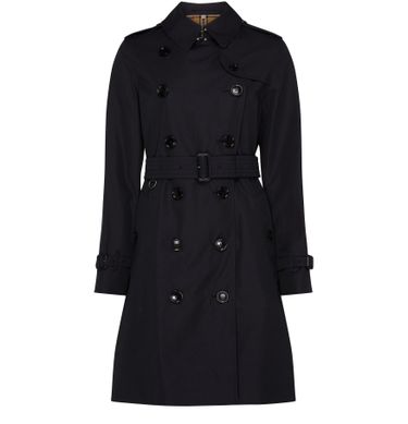 Mid-Length Kensington Heritage Trench Coat is a timeless wardrobe staple. This knee-length, double-breasted coat features a classic collar and long-sleeved design. The front buttoned closure and notched collar add sophistication, while the logo at the back label adds a touch of luxury. Perfect for completing any stylish look.