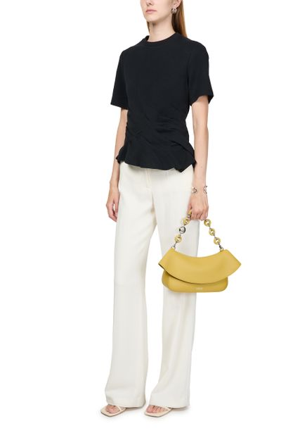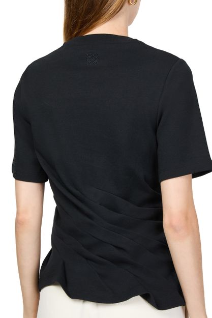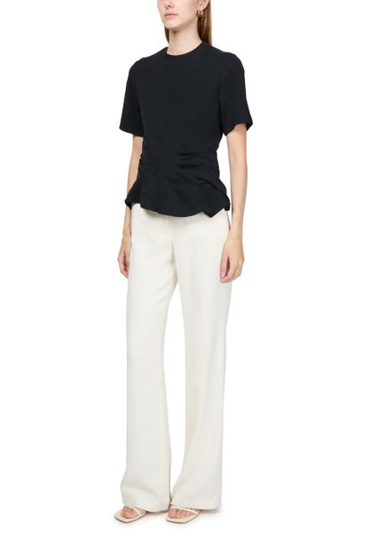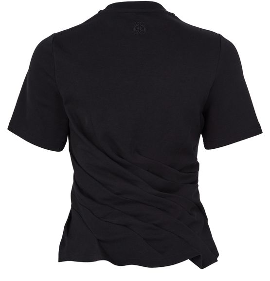 Introducing Loewe's twisted t-shirt, a modern essential. With its crew neck and short-sleeved design, this slim fit top is gathered at the waist for a flattering silhouette. Crafted for a cropped look, it adds a contemporary edge to any outfit.