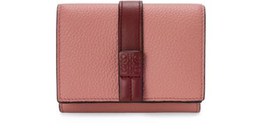 Reveal Loewe's anagram wallet in supple grained leather, featuring three compartments and a signature medallion detail. The visible stitching, embossed front logo, and silver finish highlight refined craftsmanship, while interior card slots and a secure snap-button closure offer both style and practicality.
