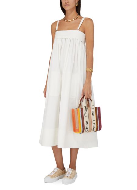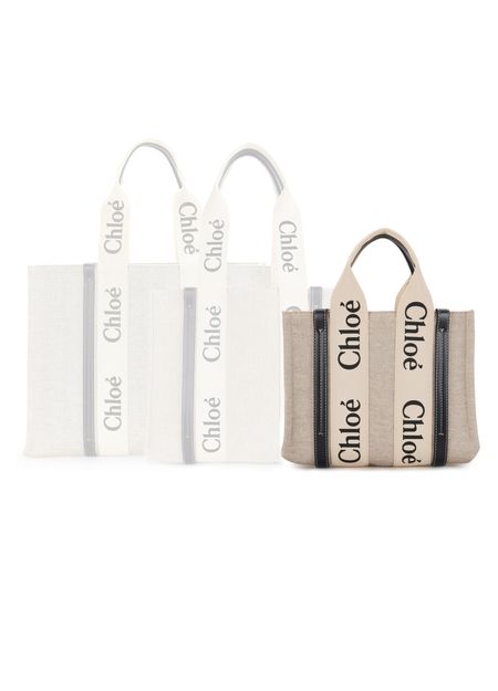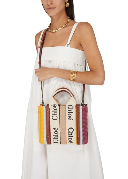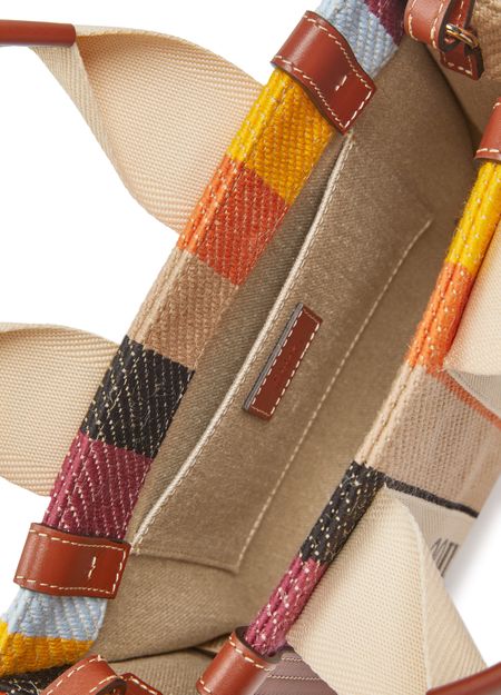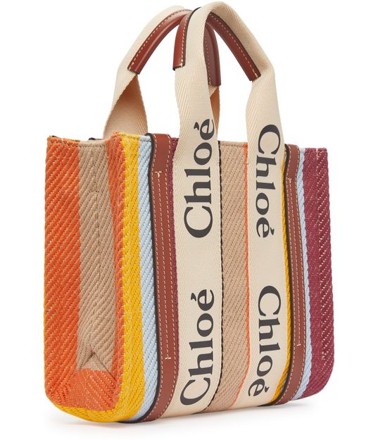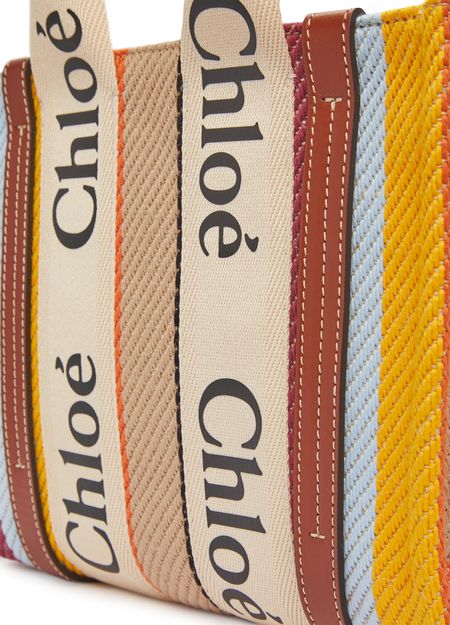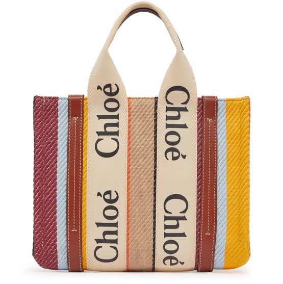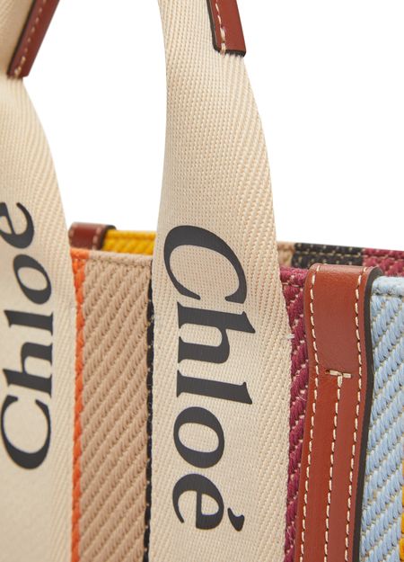 Punctuated by a large vertical stripe pattern, the Woody tote features charming canvas handles embellished with Chloé's jacquard lettering and a slender detachable shoulder strap.