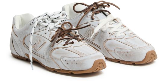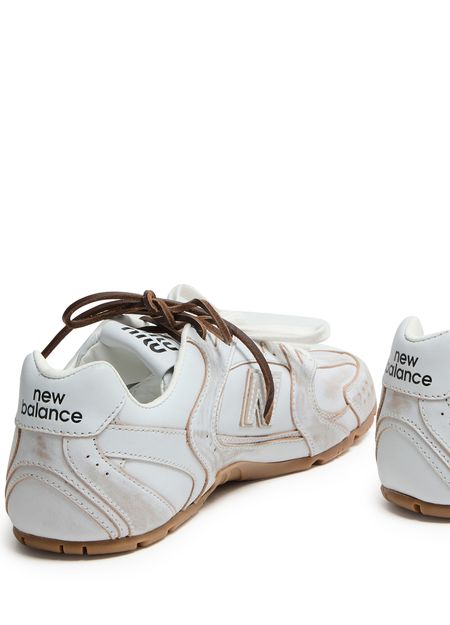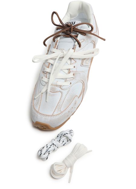 Reveal Miu Miu's low-top sneakers, crafted from smooth leather with a round, closed toe and flat heel for everyday ease. Contrast stitching and a running sole add a dynamic edge, while the iconic logo on the side and tongue ensures instant recognition. Laces and strap complete the modern silhouette.