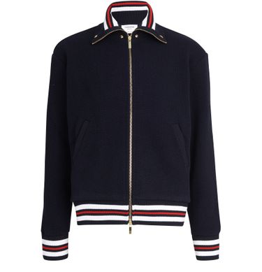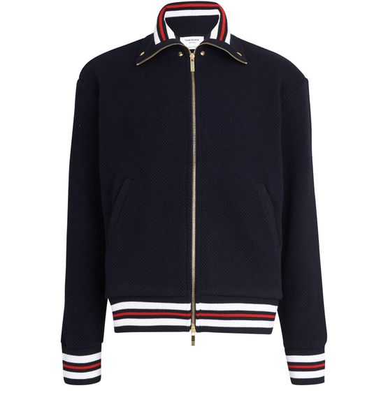 Thom Browne's zippered jacket invites men to enjoy a blend of coolness and class. The band details at the bottom and neck punctuate this textured garment.