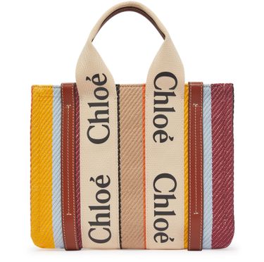 Punctuated by a large vertical stripe pattern, the Woody tote features charming canvas handles embellished with Chloé's jacquard lettering and a slender detachable shoulder strap.