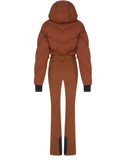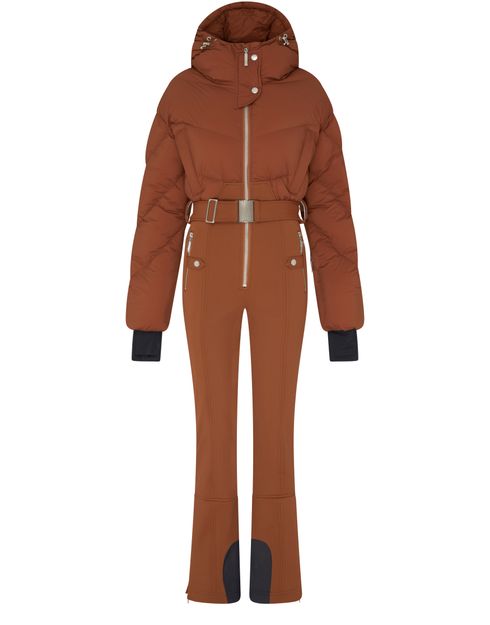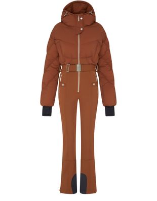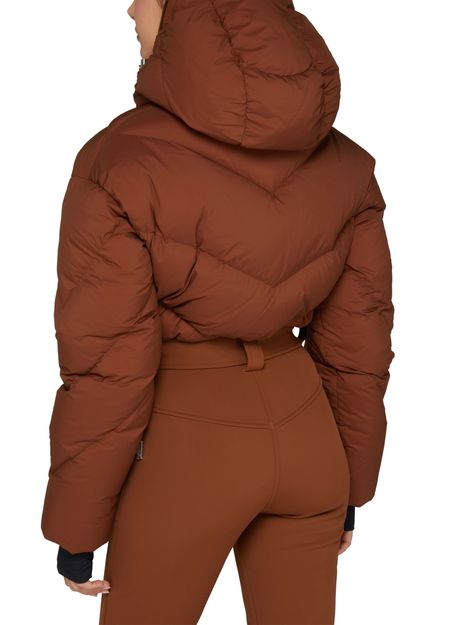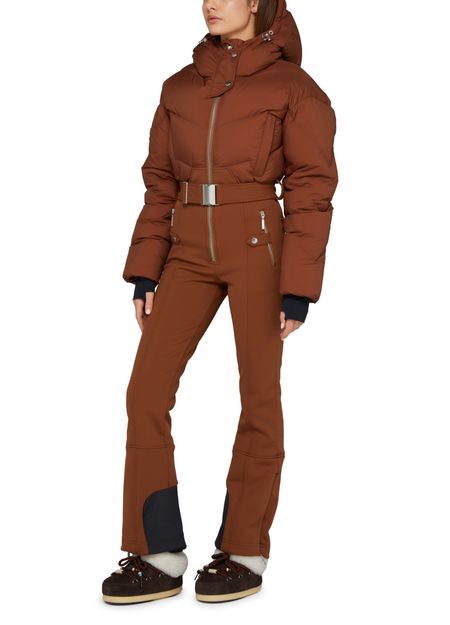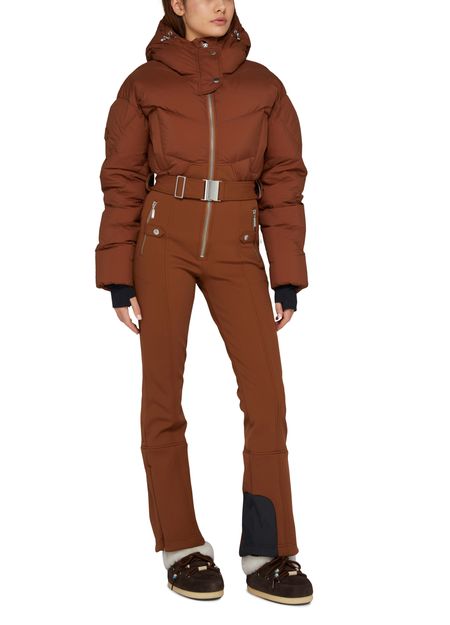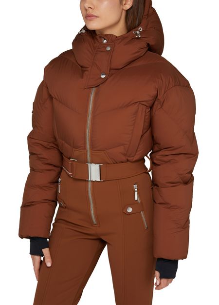Cordova's Ajax ski down jacket showcases a long silhouette with a secure zipper closure. Its padded texture and visible stitching offer both style and warmth. The long-sleeved design features cuffed sleeves, a cozy hood, and practical side welt pockets, while a belted waist enhances the flattering fit for any winter adventure.