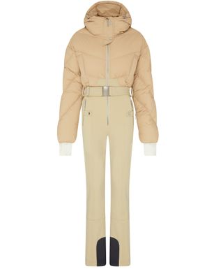 Cordova's Ajax ski down jacket showcases a long silhouette with a secure zipper closure. Its padded texture and visible stitching offer both style and warmth. The long-sleeved design features cuffed sleeves, a cozy hood, and practical side welt pockets, while a belted waist enhances the flattering fit for any winter adventure.