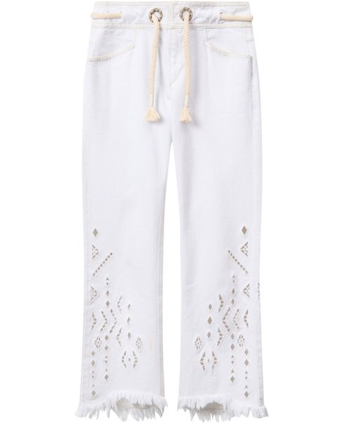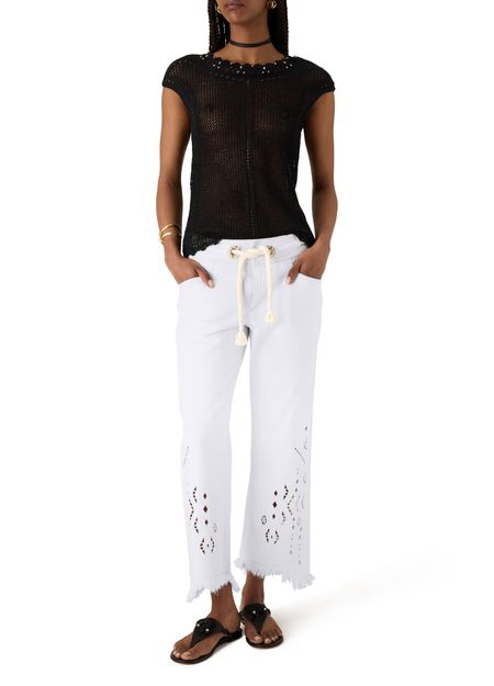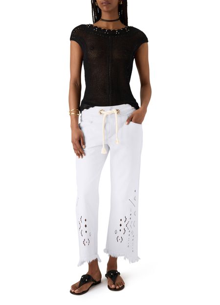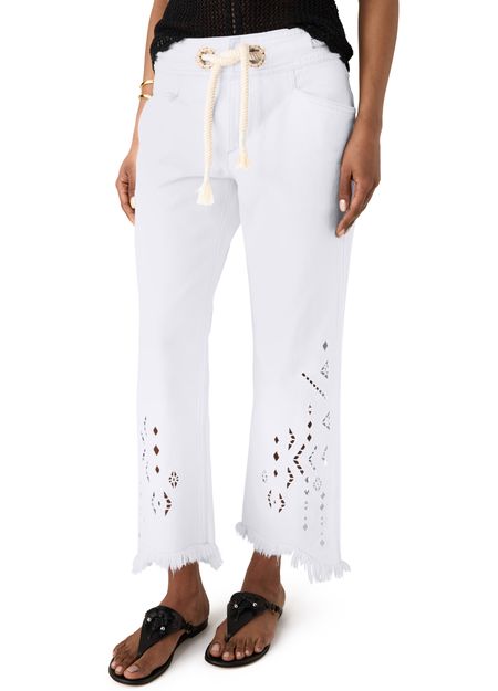 Reveal Isabel Marant's Alison lace-up pants, featuring a calf-length silhouette with fringe accents and visible stitching. The adjustable drawstring waist ensures a personalized fit, while two front pockets add practical flair. This piece effortlessly blends comfort and modern edge for versatile, everyday styling.