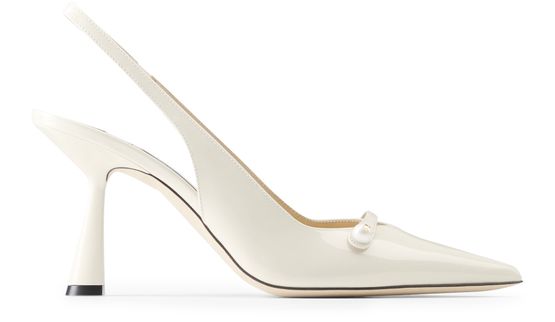 Introducing Jimmy Choo's Amita 85 pumps, crafted from elegant patent leather. These high stiletto heels feature a closed pointed toe that accentuates their sophisticated design. The pearl-embellished ankle strap and visible stitching seamlessly combine for a chic finish, while the logo-printed insole completes this statement piece.
