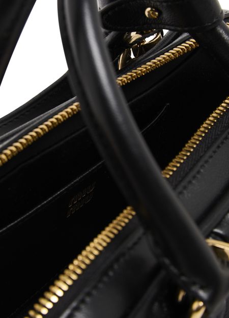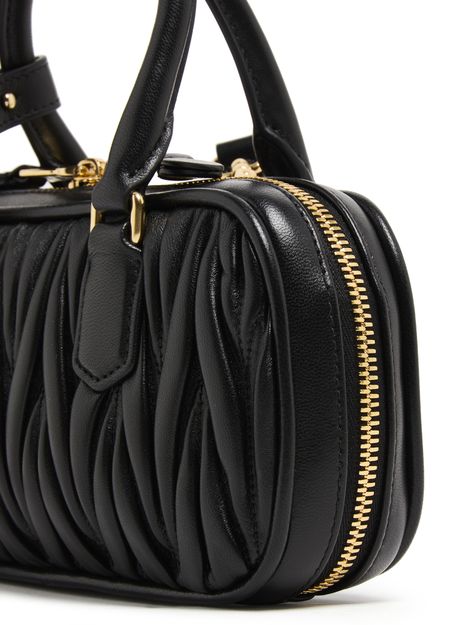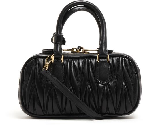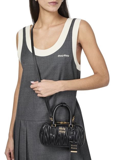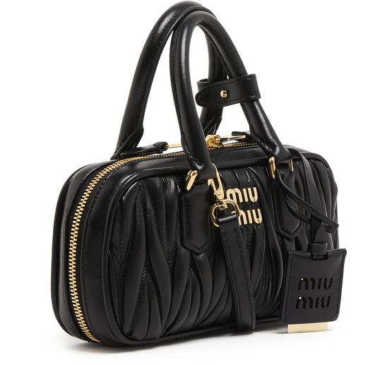 Miu Miu's Arcadie mini quilted nappa leather bag boasts a sleek design with a zipper closure and a single compartment for essentials. Its gold finish and metallic logo on the front add elegance, while double handles and a detachable strap allow for versatile wear. Interior patch pockets enhance organization, making it perfect for hand carrying or worn crossbody. Visible topstitching and an engraved logo complete...