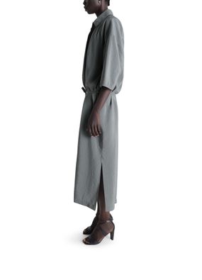 Reveal Lemaire's asymmetric shirt dress, defined by its long silhouette and distinctive dolman three-quarter sleeves. The notched collar and button fastening add a refined touch, while the front slit and asymmetric cut create a modern, fluid movement—perfect for elevating your day-to-evening wardrobe.