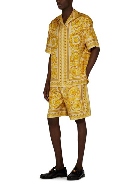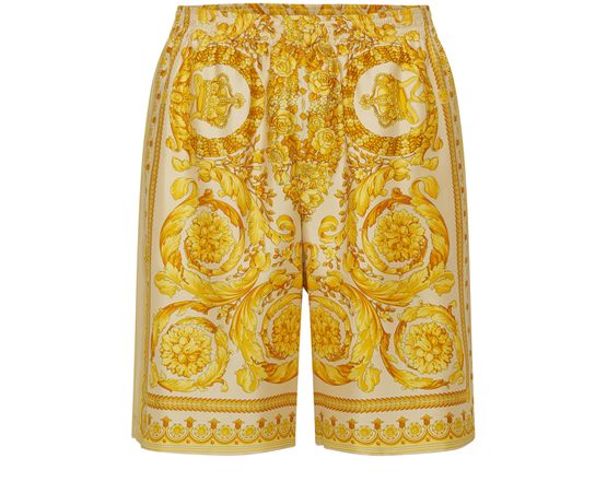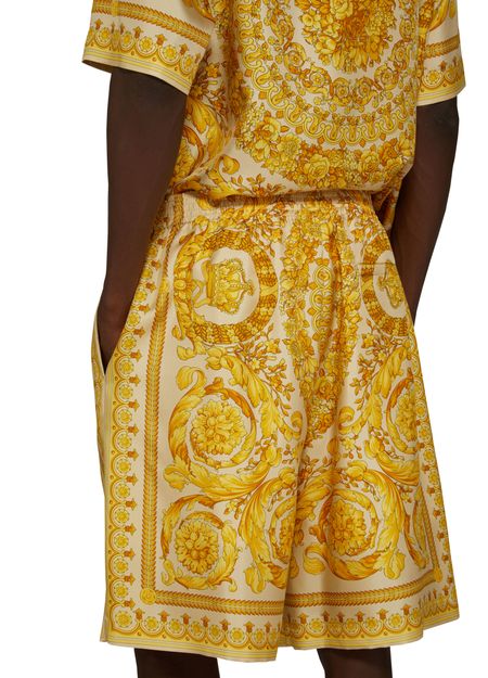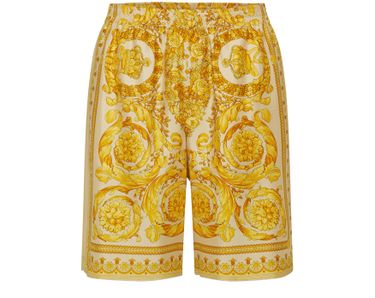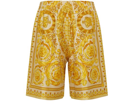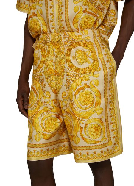 Versace's Barocco Print Shorts offer a stylish long shorts design with a straight cut that flatters any figure. The elasticated waist ensures a comfortable fit, while the printed fabric showcases the brand's emblematic pattern, making a bold statement. Elevate your wardrobe with these iconic shorts that blend luxury and leisure.