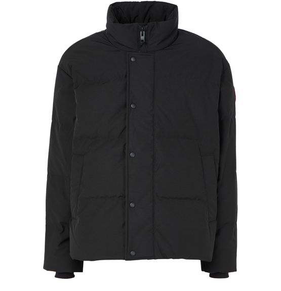 Introducing Canada Goose's Bayview parka, a stylish puffer jacket with a boxy fit and short length. The concealed zipper and snap fastening ensure a sleek look, while side pockets add practicality. Its padded texture and high neck make it perfect for versatile styling, from casual outings to more formal occasions.